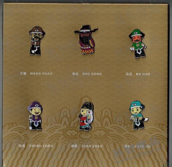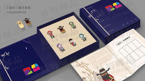 包公是刚正不阿,严格执法的典范,一直以严肃的形象示人。而《包公》徽章套装里的徽章采用卡通形象,活泼可爱,即可收藏又可佩戴,增加产品的趣味性和实用性。徽章人物分别是:包公、展昭、张龙、赵虎、王朝、马汉。