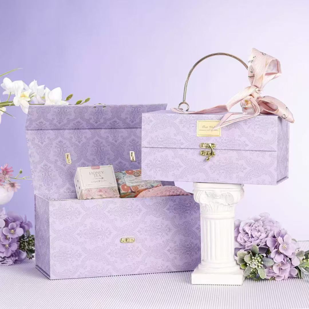 外观设计:以温柔淡紫为底色,搭配复古暗纹,搭配金属质感提手与精致锁扣,再点缀柔美丝带,整体轻奢雅致,尽显高级感,完美契合浪漫温馨的送礼氛围。