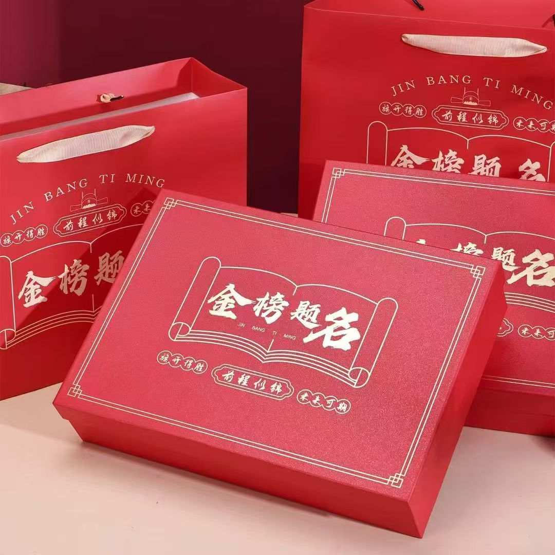 外观设计:以红金经典配色为主,盒身印有「金榜题名」书法字样及对应拼音,搭配传统纹样边框,既契合升学、谢师宴的喜庆氛围,又传递对学子的美好祝福。